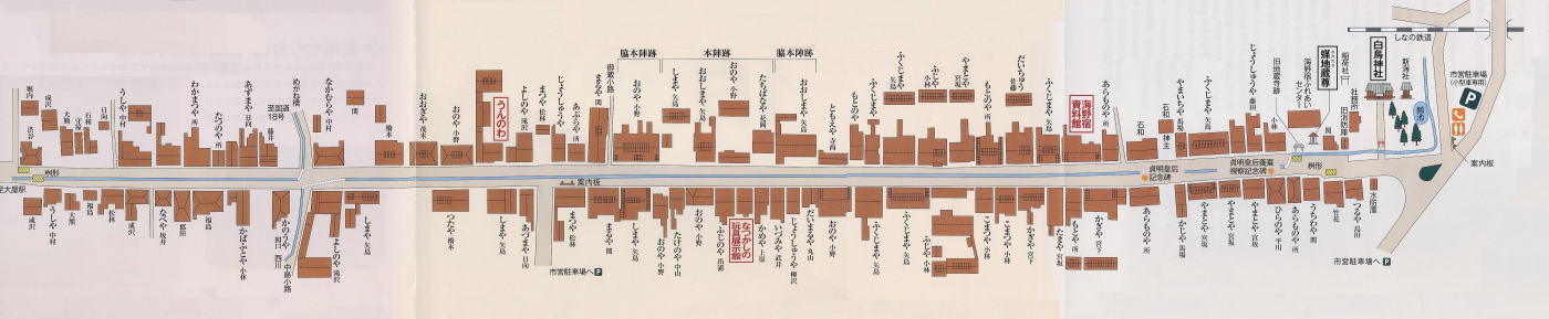 往時は白鳥神社前(東桝形)から西桝形まで宿駅としての街並みは6町(650メートル)ほどの長させした。この街並みは「上宿」「中宿」「下宿」と3つの街区に分かれていたそうです。しかし、本陣跡辺りが中宿であったこと以外には、どこまでが上宿あるいは下宿だったのか、今は不明です。
