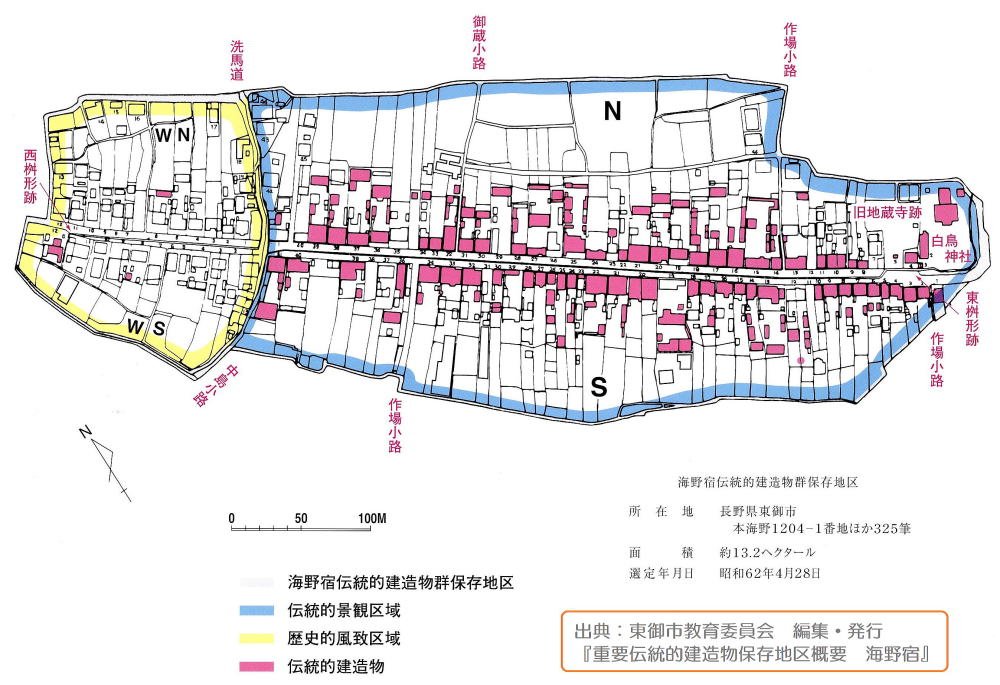 北国街道海野宿の街並みのうち、Gの白鳥神社から西桝形跡までが「海野宿伝統的建造物群保存地区」の指定されています。そのなかでも、白鳥神社から洗馬道・中島小路までが「伝統的景観区域」で、そこから西側の西桝形跡までが「歴足的風致地区」となっています――下掲絵地図参照。