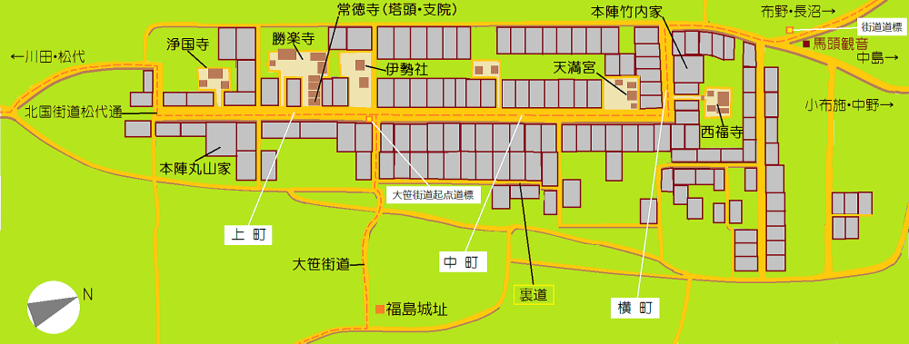 上の絵地図は、幕末の頃の福島宿の町割りと街道筋を示すものです。明治初期の絵図をもとに修正を加えて復元した想像図です。絵地図から福島宿が南から上町、中町、横町の3つの街区から形成されていることがわかります。