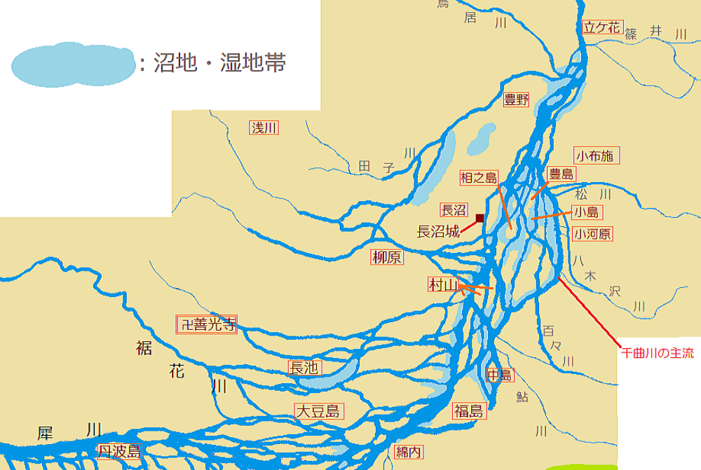 17世紀に始めに北国街道松代往還が開削される頃から、宿場街近隣から用水整備にともなう干拓、水田開拓が進み千曲川東岸の高台や自然堤防に人びとが集落を形成し始めたようです。想像図では、東岸の湿原沼沢地の広がりは、はかなり控えめに見ても最低限度これくらいだったであろうという推定にもとづいています。
