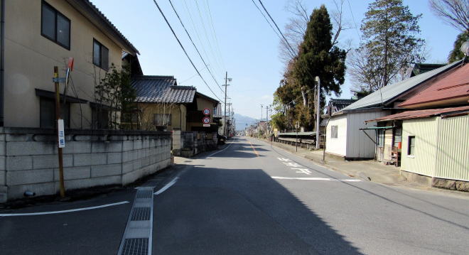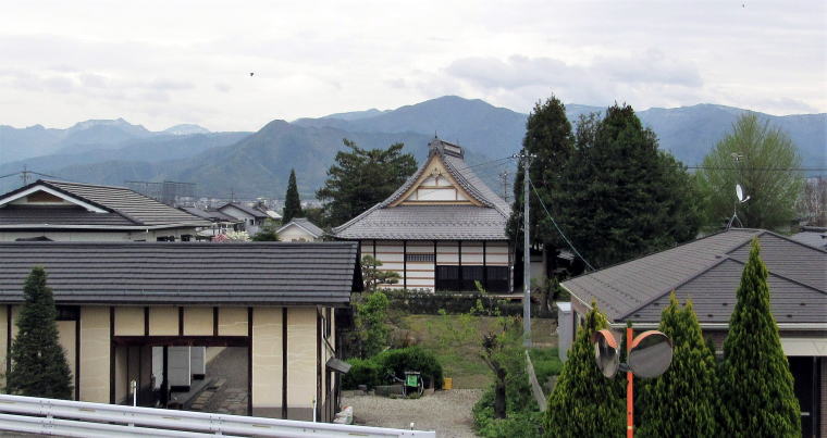 ![]() 千曲川堤防から眺める横町の家並みと西福寺本堂: その背景には奈良山、右には万座高原、左は志賀高原 ![]() 旧街道では、鉤の手の曲がり角で左に向かう道はなかった。右に曲がると、西福寺の参道。 |