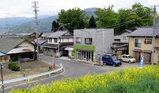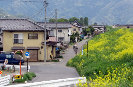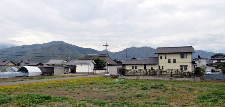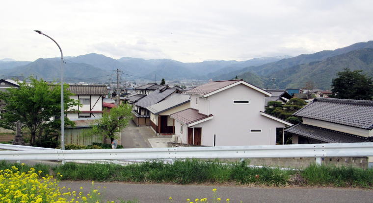 ![]() 千曲川堤防から眺める横町区の集落北端の風景。背景は左から井上山、綿内の太郎山と妙徳山、その右手が奇妙山。 ![]() 一番手前が堤防道路でその下が旧街道の遺構に建設された道路。奥に向かって横町の小路が東西に延びていく。 |