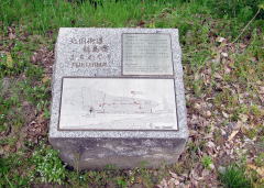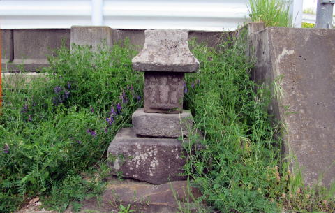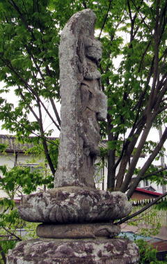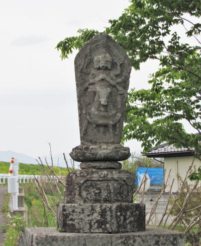 旧街道の遺構脇にはきわめて珍しい形状の馬頭観音像が置かれています。この観音様は、馬にまたがっている姿なのです。石垣の上に台石を置き、その上に観音像を配してあります。 |