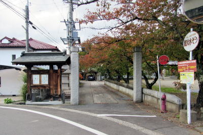 ▲飯山街道の右脇に圓徳寺の参道入り口の門柱が立つ