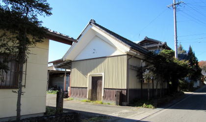 ▲旧飯山街道左脇が脇本陣跡。重厚な土蔵が昭和前期の面影を残す。