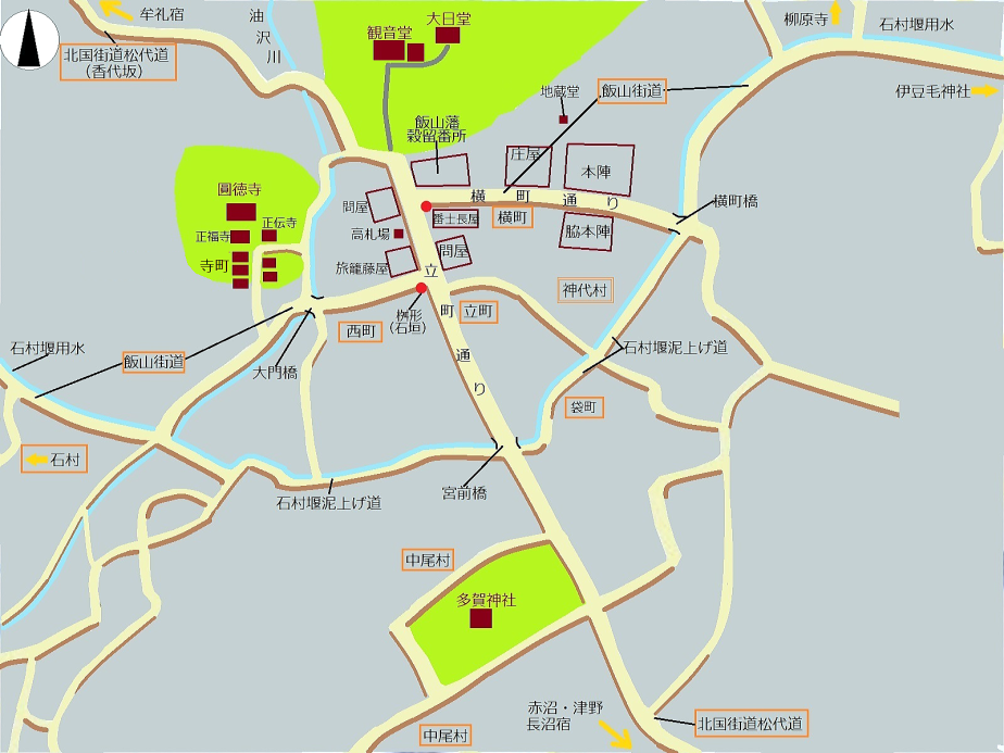 上の絵図は、江戸時代の神代村(神代宿)界隈の北国街道松代道と飯山街道を描いたものです。周囲や近隣の道は、『豊野町誌』などの記事、私自身の豊野町の探索にもとづいて推定・想像したものです。