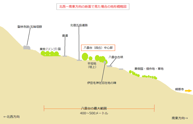 ■史跡 八雲台古墳■ 八雲台は豊野の横町から北に700メートルほど離れた丘陵斜面にある段丘高台です。高台壇上の面積はだいたい1ヘクタールですが、聖林寺跡辺りから緩やかな斜面が続いています。しかし、神社跡地の碑は壇上の平坦地というよりも、むしろそこに続く急斜面に設置してあります。いったい、八雲台という地名はどこからどこまでを指すのか、わからなくなりました。