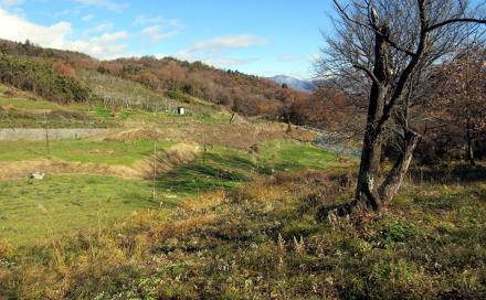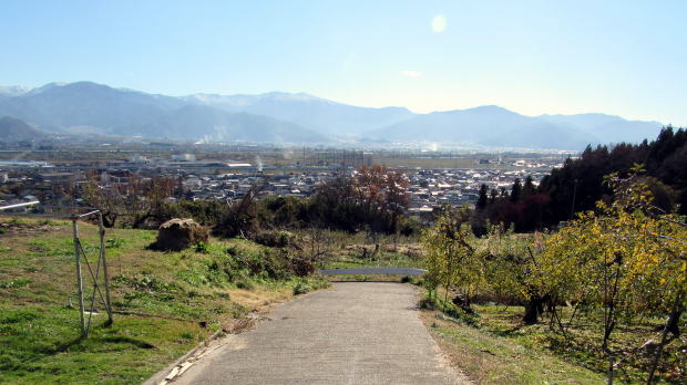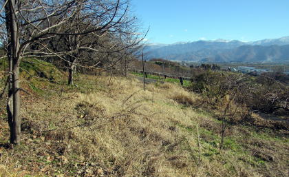 ![]() ▲八雲台古墳は段丘の壇上から20メートルほど下の斜面に位置している。右奥に見えるのが椅子脳神社跡の碑。 ![]() ▲南東向きの斜面を下っていく農道。この丘の下に旧飯山街道、柳原寺、横町がある。 右端の森は観音山。はるかな背景の山岳高原の中央部は根子岳・菅平高原。 |