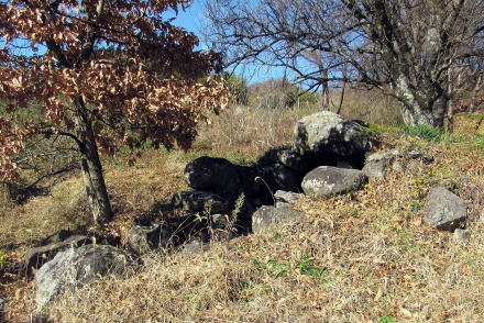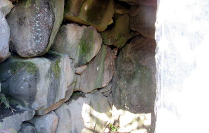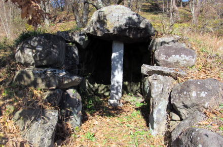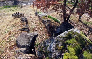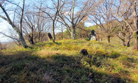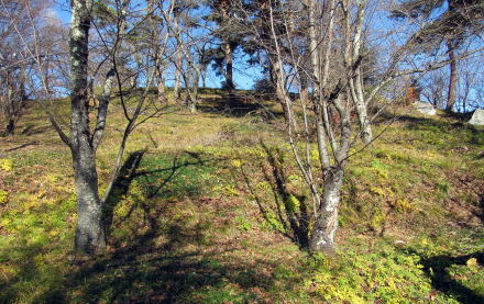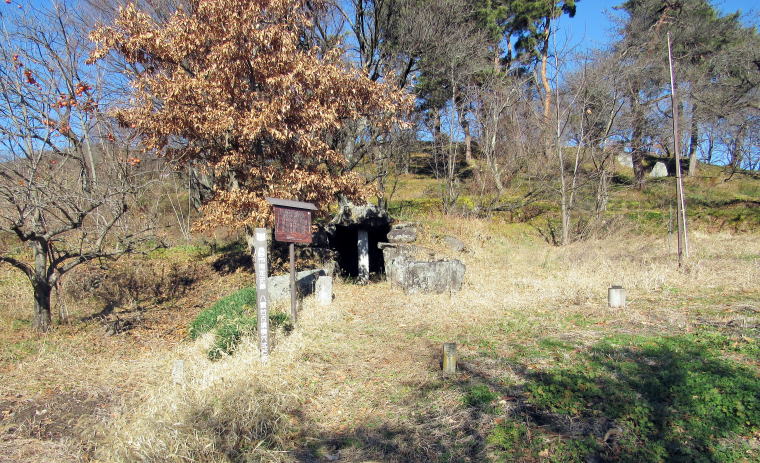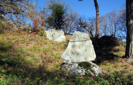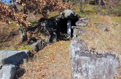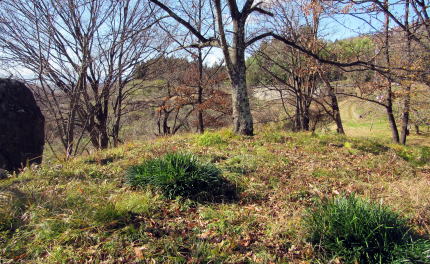 ![]() ▲横穴石室の開口部(南側から見た形)。石組は支柱で支えられている ![]() ▲石室内の積み石の様子(3~4段積み)。右端は石製の支柱。 ![]() ▲基礎部の石が並ぶ南端部。墳丘はほとんど失われている。 ![]() ▲斜面を利用して墳墓を構築してある ![]() ▲古墳の東側の斜面の様子。背景の山岳は志賀高原。 ![]() ▲古墳の背後に急斜面が迫る。斜面の上は平坦地の壇上。 ![]() ▲八雲台と彫られた自然石の神石。しめ縄がまかれている。 ![]() ▲段丘上は周囲よりもうず高い盾状の尾根峰になっている ![]() ▲山桜の叢林となっている。春には美しく花が咲き誇る。 ![]() ▲背後の山腹との間は平坦窪地になっている |