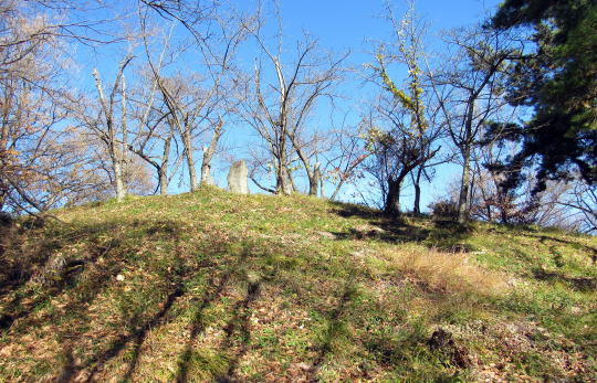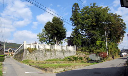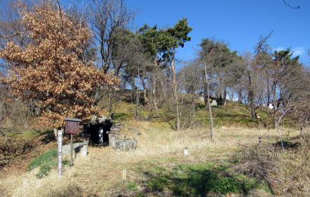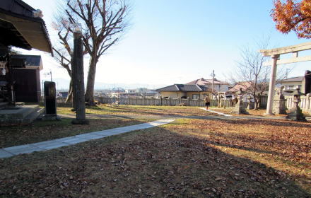 ![]() ▲伊豆毛神社の境内参道入り口と大鳥居。左端の玉垣(石柵)の下の道が旧飯山街道。 ![]() ▲1523年に現在地に移する転前に神社があった八雲台の丘 |