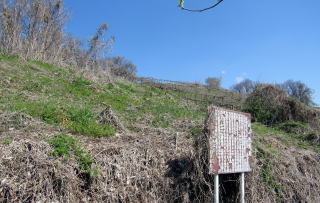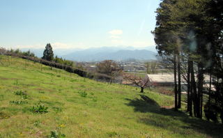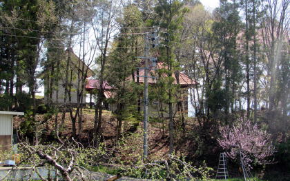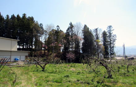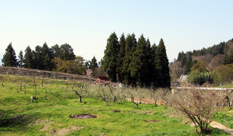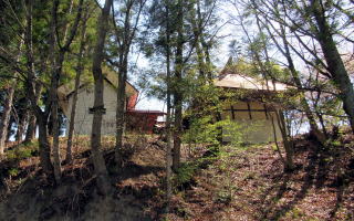 ![]() ▲奈良時代の山の神のぼり窯跡の近くからの穂長神社の眺め。傾斜が緩やかになった段丘の上に神域がある。 鎮守の杜の右奥に見えるのは、長秀院の堂宇の屋根。超衆院は沢を挟んで隣にあるようなもの。 |