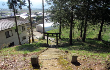 主祭神は、五穀豊穣と食物をつかさどる保食神ですが、明治41年の祠堂合祀令によって境内に山の神、伊勢社を合祀したそうです。 神社が位置する斜面の傾斜が比較的に緩やかな宮前地区は、北から張り出した2筋の丘尾根の間の谷間にあります。往古、地滑りで形成された丘陵の凹みではないでしょうか。