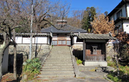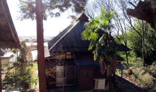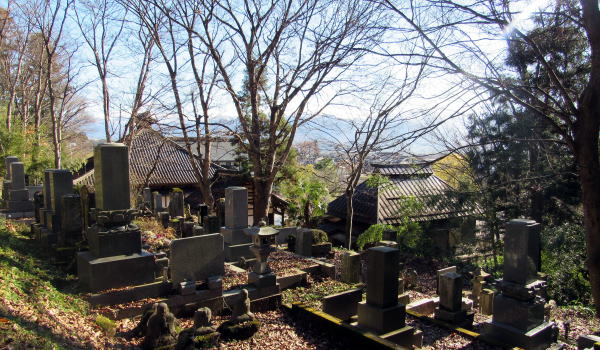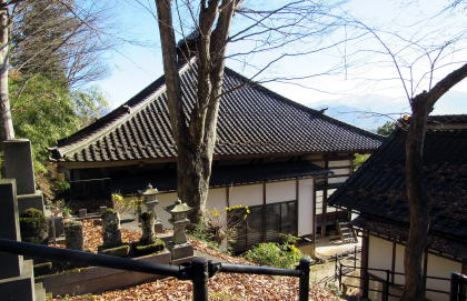 ![]() ▲参道中ほどから本堂を眺める。参道右側に見えるのは萬霊塔、六地蔵、石段脇には稲荷社石祠。 ![]() ▲裏山の墓苑から本堂などを眺める。脇には観音堂、禅堂・庫裏だったとみられる建物もある。 |