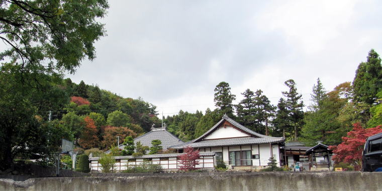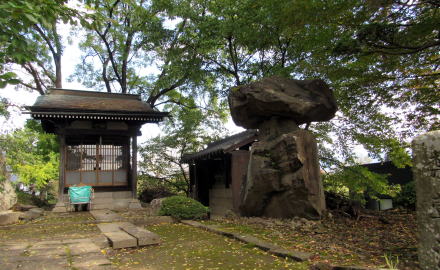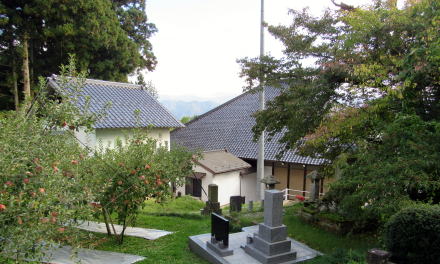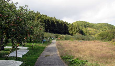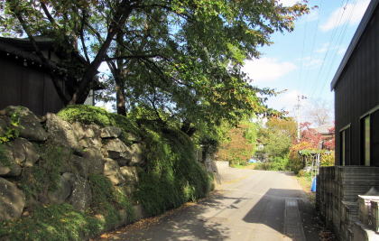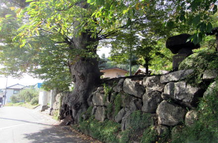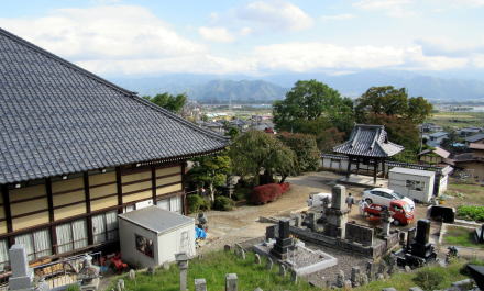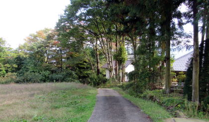 ![]() ▲寺の背後に迫る丘陵にはリンゴ畑。上の丘に石村城があった。 ![]() ▲寺域裏の松並木の下を往く細い山道。本堂の屋根が見える。 ![]() ▲背後の山腹丘陵のリンゴ園の下に境内がある |