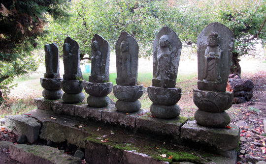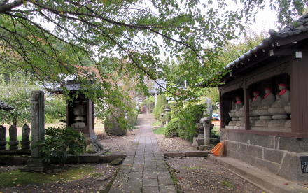 ![]() ▲丘陵斜面の段郭のような境内に並ぶ堂宇はあたかも城砦のごとき構えだ ![]() ▲六地蔵堂の背後の六地蔵。寺域参道沿いには数多くの石仏・石塔が立っている |
