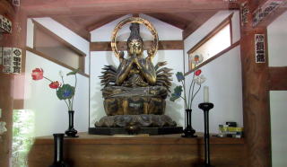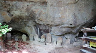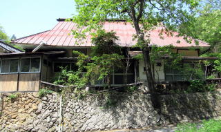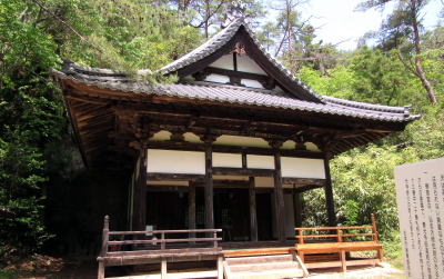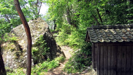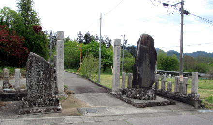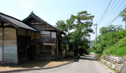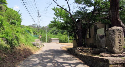 そこからさらに300メートルくらい歩くと、街道の東脇に祈りの場の跡のような雰囲気の古い建物や門の跡と思しき塚が見えてきます。ここは、大門と呼ばれていた地籍だそうですから、丘の上にある大きな寺院、無量寺――中世までは真言密教の修験拠点だったか――の参道が始まっていた場所で、往古には門前町集落があった跡地だと見られます。ここから岩井堂観音堂の辺りにかけては、室町時代までは密教修験の霊場としての堂宇群や宿坊群があって栄えていたのではないでしょうか。