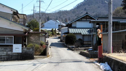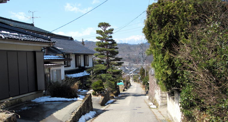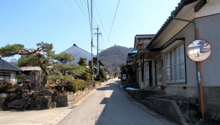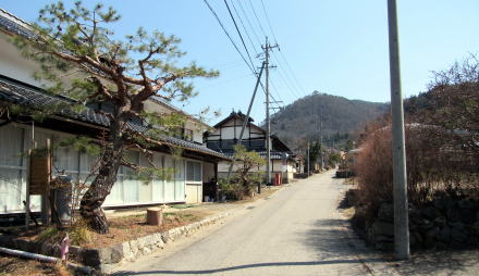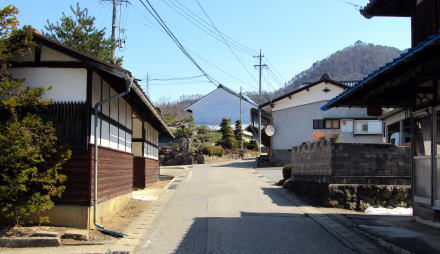 ▲青柳城館跡の下で北向きに通る旧街道沿いの家並み