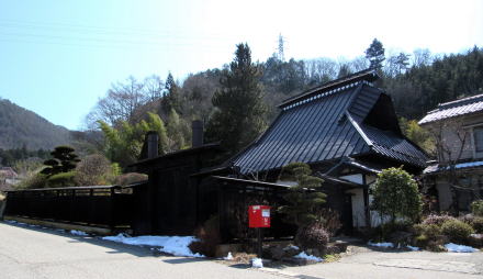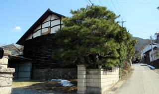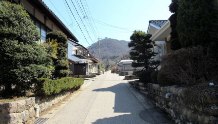 本陣問屋から130メートルほど急な坂道を歩いたところで、旧街道は120°位の角度でに曲がり北向きになり、さらにおよそ120メートルほど往くと、また直角に曲がって西向きに進みます。戦国時代まで山裾の領主館に下に形成した街集落を街道宿駅にしたために、コの字型の道筋と街並みになったということです。