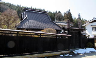 ▲昭和中期の造りの長屋門の前を往く旧街道