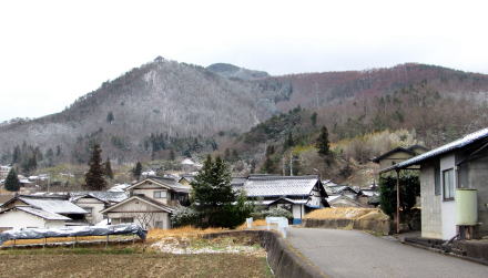 ▲旧青柳宿の集落は山懐にあって、尾根丘に囲まれている