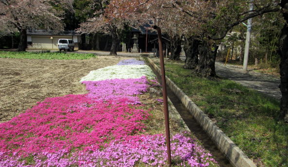4月中旬に探訪したのですが、桜の開花が平年よりも10日も早く、花は散りかけていました。しかし、隣の畑のシバザクラは今を盛りと咲き誇っていました。