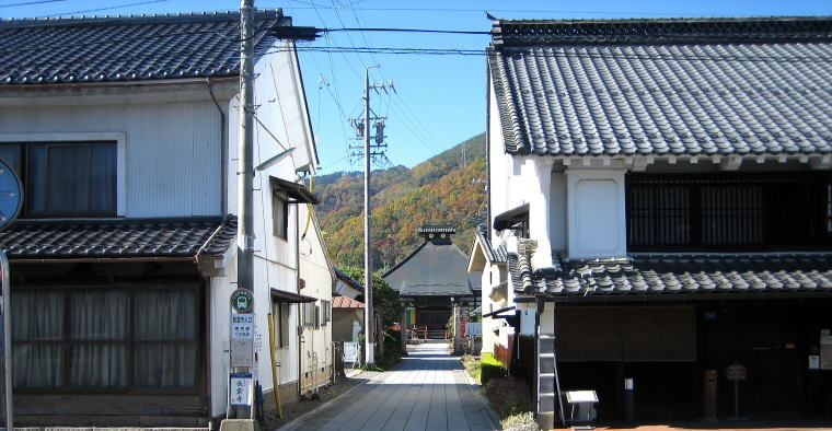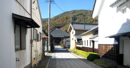 ![]() 重厚な蔵造り商家古民家の間の参道小路の奥に長雲寺本堂を眺める |