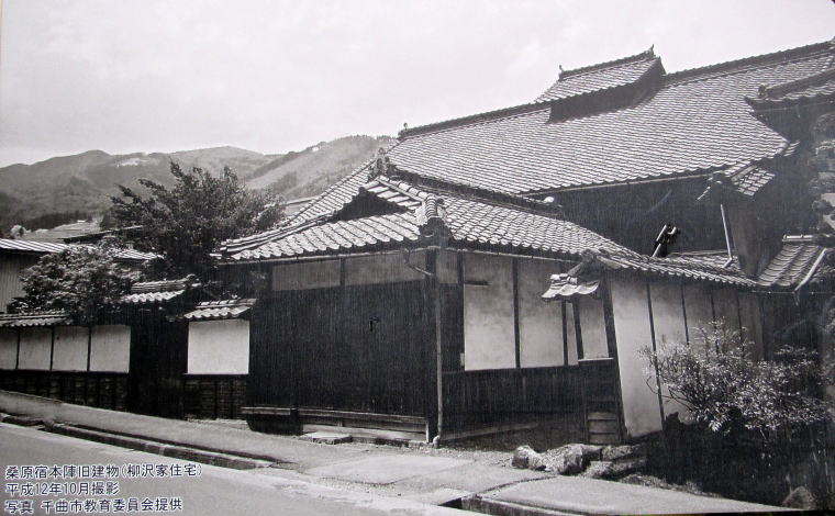 ![]() 桑原宿の街並みの中ほどに掲示されている、旧本陣柳沢家住宅の写真(撮影2000年10月):千曲市教育員会提供 屋敷地は分割されて小さくなり、家屋は昭和期に修築され、江戸時代のものではなかった。撮影の翌年に解体された。 |