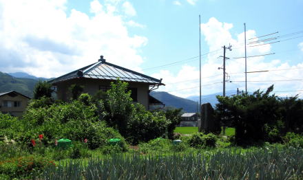 有岡田宿本陣跡から北西に160メートルくらい離れた農耕地帯のなかに大願寺跡があります。明治維新のさいに松本藩の廃仏毀釈によって廃寺となり、寺の記録は廃棄または散逸して何も残っていないそうです。仏像などはいくつか残っているとか。 ◆宿場街ができる前に移設建立された寺院◆ |