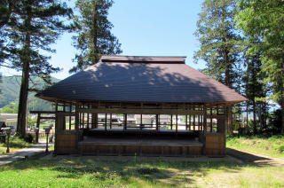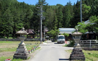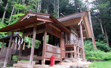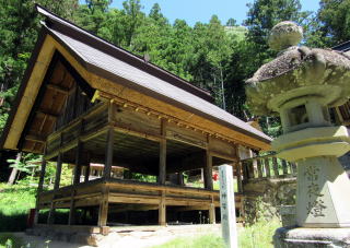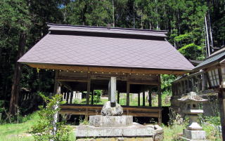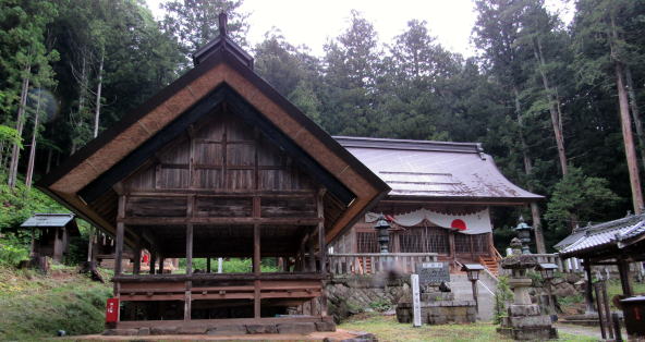 参道を歩いて境内に近づくと、大きな造りの舞殿が迫ってきます。神楽殿は奥にあって神楽舞の奉納はそこでおこなわれるはずなので、舞殿はおそらく村芝居などに用いられてきたのでしょう。
