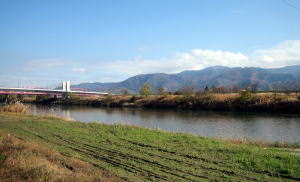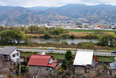 長峰山の東側斜面は千曲川の浸食でつくられたもので、河岸段丘となっています。千曲川河床と段丘上部の高低差は、最大で50メートルほどもあります。