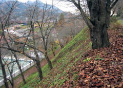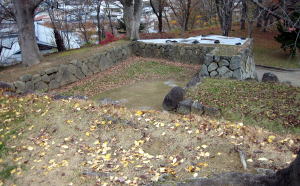 江戸時代前期までは、この盆地を流れる千曲川は何筋かに分流して、飯山盆地はいたるところに湿原があったようです。その痕跡は、20年ほど前まで丘の際まで湿田が広がっていたことです。飯山城の堀は湿原を掘り下げてつくり、千曲川本流だけでなく、そういう分流から水を引き込んでいたはずです。湿原の水を掘りに落として集め、城の周囲に干拓や土盛りを施して武家屋敷街や商人街を建設したものと思われます。