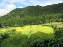 映画『阿弥陀堂だより』に登場した棚田です。高齢化や過疎化で一時は荒廃していた棚田は修復・復元され、「日本の原風景」が保たれています。 |