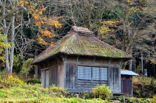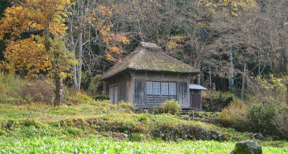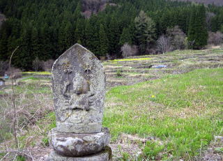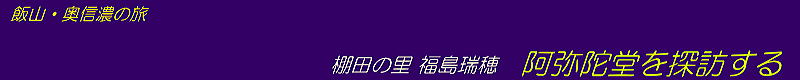 さて、阿弥陀堂がある場所は、福島水穂地区でも山腹の上部で深い山林が棚田地帯の背後に迫っているところです。阿弥陀堂は棚田の一番上で杉の森の手前に移設されています。この森は小さな神社の鎮守らしく、森のなかを参道が社殿まで続いています。