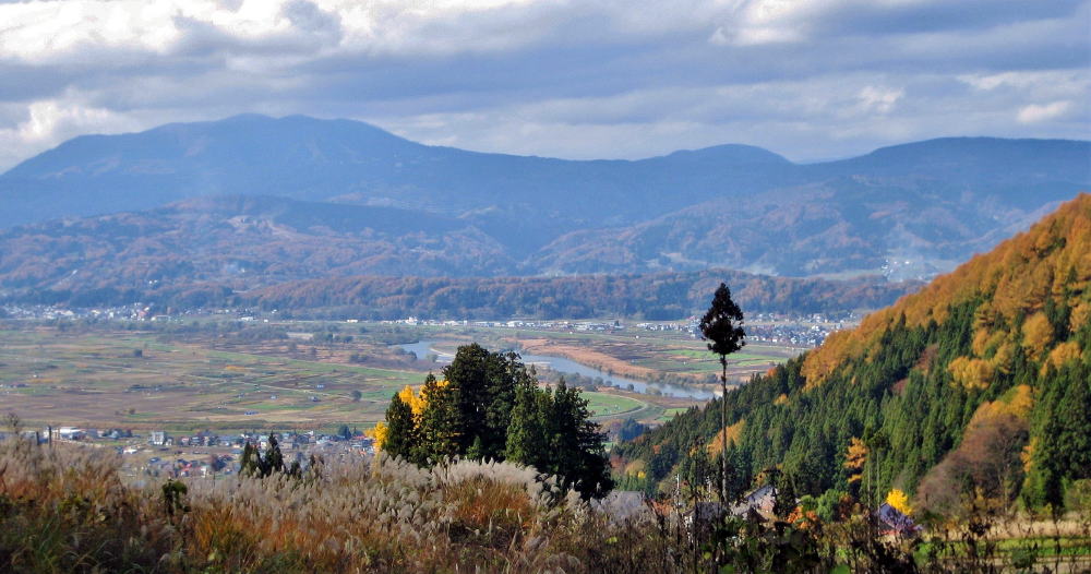 千曲川は、飯山市をほぼ北ないし北東に向かって流れています。この大きな川は、流域両岸を侵食して南北に長い飯山盆地をつくり出しました。盆地は幾段かの河岸段丘を経て、山裾に達します。