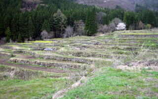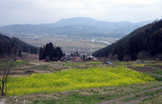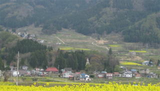 それでも山裾の棚田の景観を守り、石垣や耕地の崩落を防ぐために、地区の人びとが野沢菜畑としています。野沢菜はアブラナの仲間のカブで、春には菜の花を咲かせます。 菜の花を見ようと、毎年春にはたくさんの観光客がやって来ます。