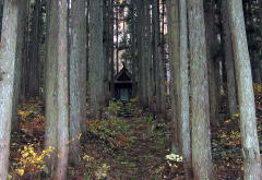 杉林の奥に続く石段参道があって、そのさきに古びた小さな社殿がある。
