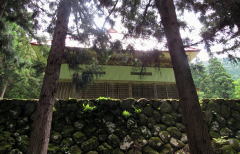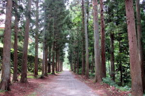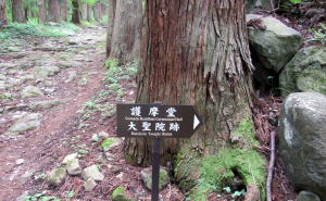 その石垣下が南北に通る杉並木となっています。石垣壇上の護摩堂を見上げながら、杉並木の道を50メートルほど南に歩いてから、石段をのぼって大聖院跡地の草原に入ることになります。