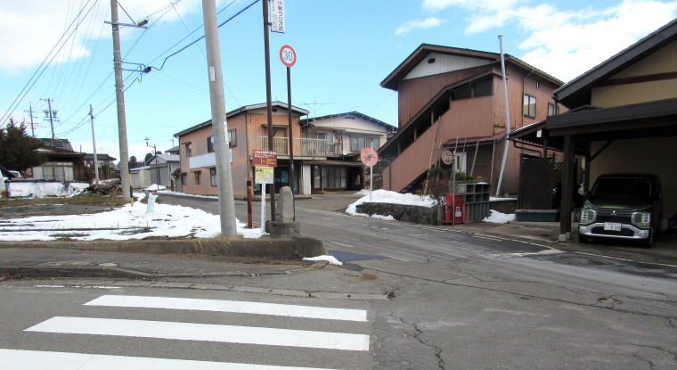 ◆浅野・橋場・中島の繁栄◆ 『豊野町誌 1』(第2章 豊野の交通と交易 第1節 街道と豊野)ではこう記述しています。 ◆大倉と蟹沢との村境を往く街道◆ 橋場は旧大倉村の最南端の集落でした。橋場の街並みの北端で旧飯山街道は、牟礼方面に往く道と分岐して北に向かいます。この分岐点に江戸時代の石道標が立っています。その表側には「右ハ飯山道、左ハ牟礼 梅ノ木」と刻まれています。