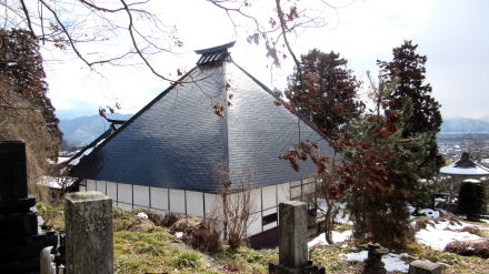 飯山街道から東の丘尾根の上に見える寺院です。龍澤寺の前身となった寺院は1212年(建暦年間)に大田郷赤沼村に創建されたと伝えられています。おそらく信州で最も古い浄土真宗の寺院のひとつです。 ◆リンゴ園が連なる丘の中腹のとんがり屋根の寺院◆ |