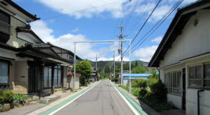 街道沿いに並ぶ本棟造りの古民家の様式は、妻入りではなく棟入りがほとんどです。その理由は、通常の切妻造りの形状に近づけて、家の高さを抑えて建築するためだと思われます。
