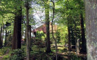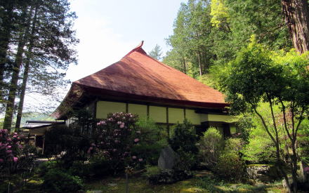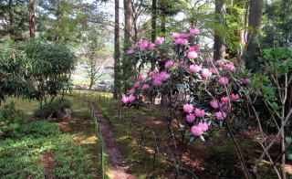 今、高台の境内は、樹林に取り巻かれていて木陰となっているため、庭園一面に苔が広がっています。この日はシャクナゲが開花して、寂寞に彩を添えていました。