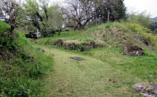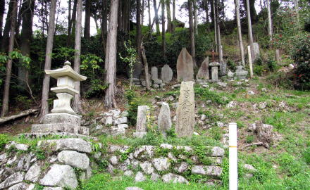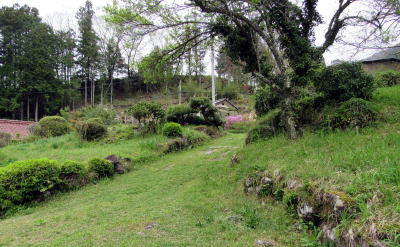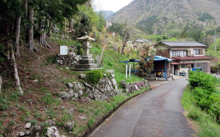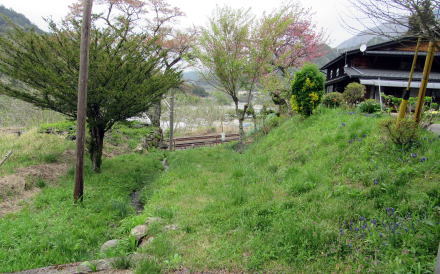 熊野十二所権現は、集落東端の馬頭観音堂辺りから河畔に伸びる尾根丘の高台に位置しています。旧中山道は、この尾根丘をのぼって横切ることになります。 ◆村落の北端で街道遺構は消える◆ 尾根丘の背にある家並みは60メートルほどで途切れ、そこから旧街道は北に向かって下ることになります。