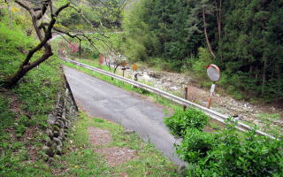 今では山林管理のために、大沢川の右岸(北岸)を渓谷沿いにおよそ300メートルのぼる舗装林道が整備されています。この林道は河岸段丘崖を迂回する道です。