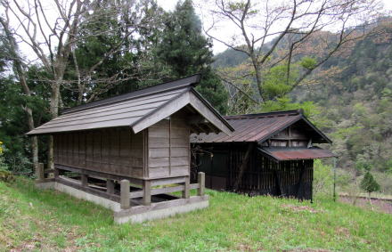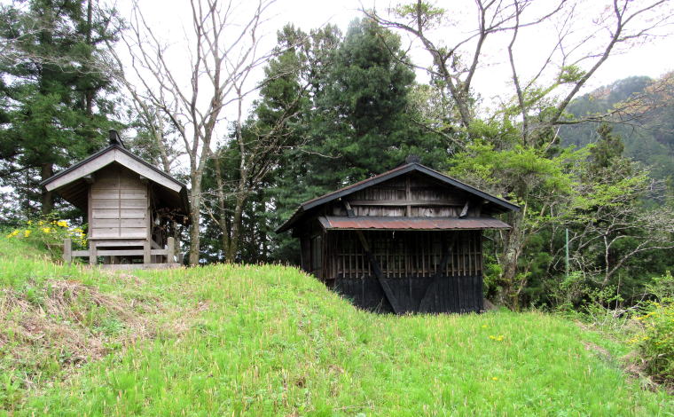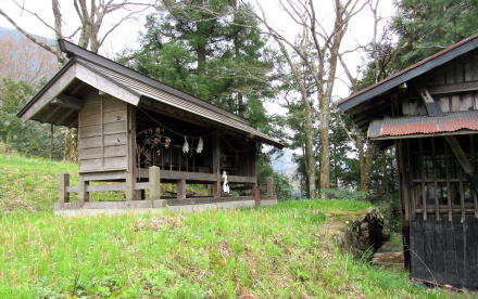 ![]() 段郭のような境内に残されている3棟の社殿。いずれも内部には神仏の本体や祠はない。 |