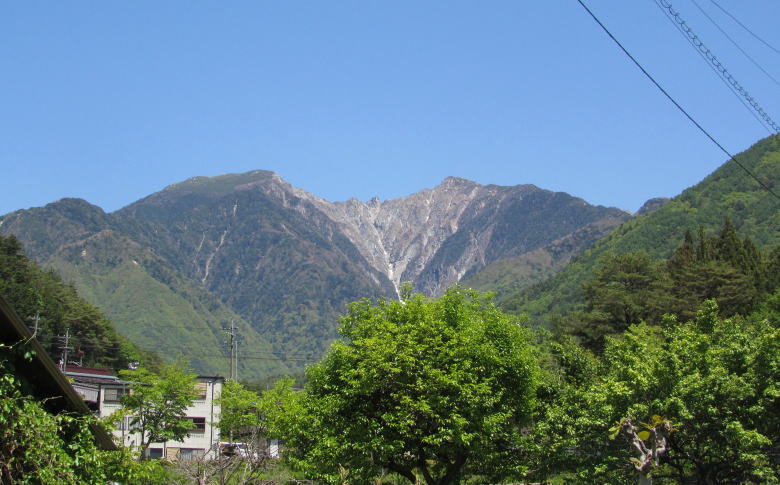 ![]() 寝覚地区の旧中山道から眺めた木曾駒ケ岳。家並みの間から望む雄大な風景。 |
