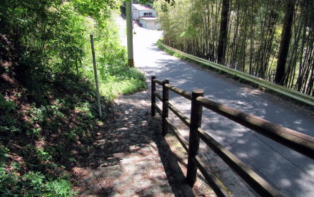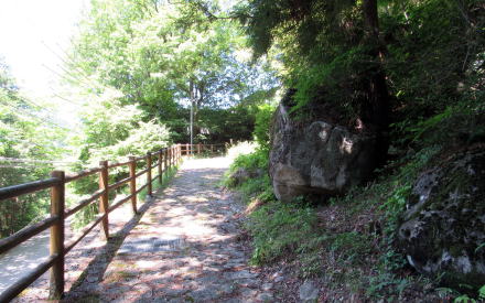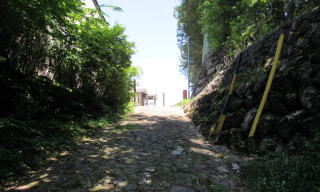さて、滑川橋を越えて50メートルほどの地点に段丘斜面を斜めにのぼっていく石畳の細道があります。これが旧中山道跡を改修した遊歩道です。石畳は昭和期に施工されたもので、きれいに切りそろえられた石が組まれています。