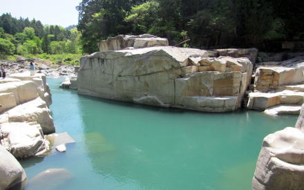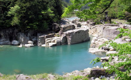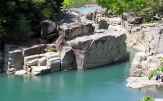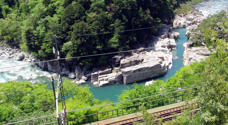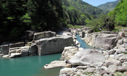 ![]() 寝覚ノ床がある谷間を見おろす。この場所だけが花崗岩の方状節理をとどめた地形になっている。 |