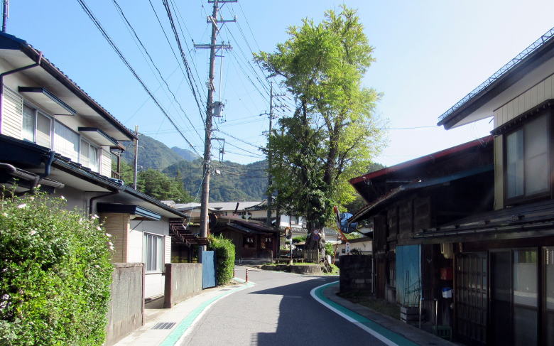 ![]() 旧中山道の越前屋旧館前からカツラの巨樹と津島社・大宮社の辻を眺める |