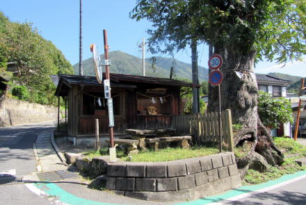 ◆大カツラの下は祈りの場所だった◆ 寝覚集落のランドマークは街道脇に立つカツラの老巨樹です。根元にある説明板によると、幹の周囲は4.1メートルだそうです。近隣の住民に聞いたところ、樹齢は400~500年だとか。