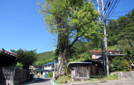 カツラの根元は三叉路になっています。木曾谷の段丘面に沿って往く旧中山道から林道が東向きに分岐していく交差点です。 |